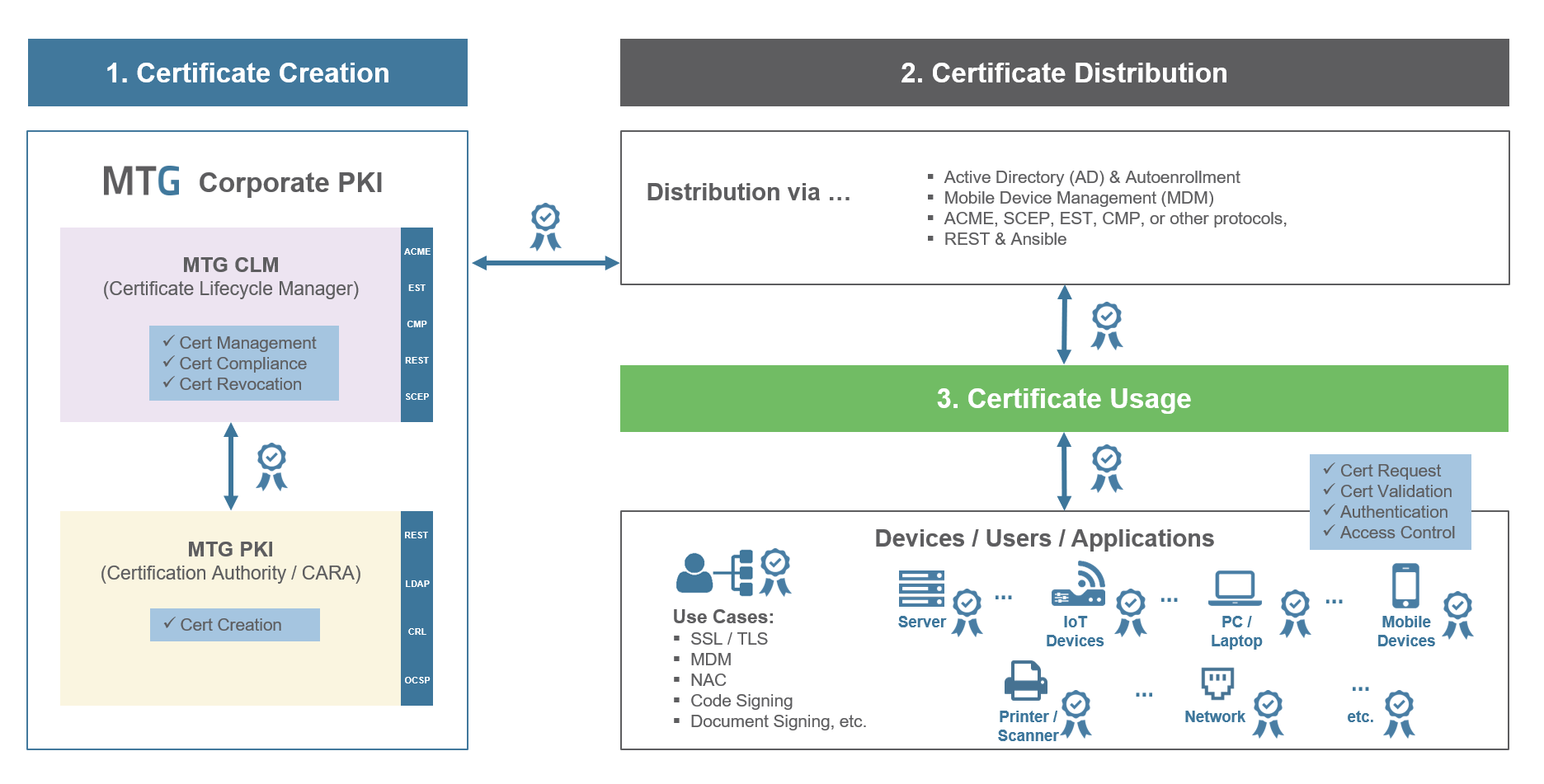 The MTG CLM supports automation across all connected CAs: MTG, Microsoft, GlobalSign, and Telekom.
